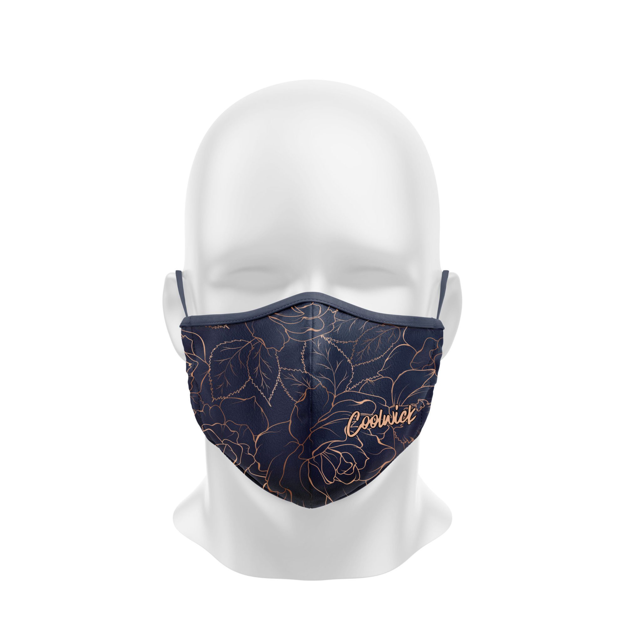 Stay 40% cooler with CoolWick. Our Navy Rose Gold dye sublimated masks are two-ply and 100% polyester that covers the wearer’s nose and mouth. Our masks are made of fabric that helps wick moisture away and helps air flow more easily through the fibers. The fabric binding has a slight stretch, while ear loops and a center seam help hold it comfortably in place all day.