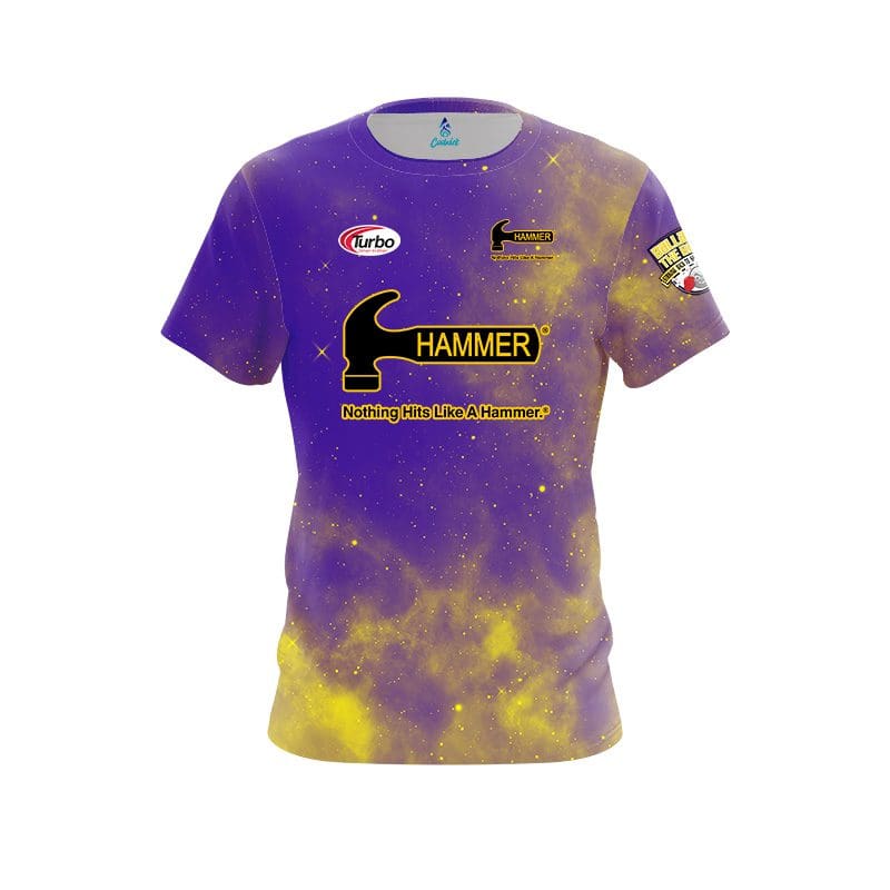 Designed, cut and sewn by hand stay 40% cooler with CoolWick. Our Nick Pate Purple Yellow Galaxy Replica CoolWick Bowling Jerseys are made of two different fabrics. The back being our CoolWick technology fabric that helps wick moisture away and helps air flow more easily through the fibers.
