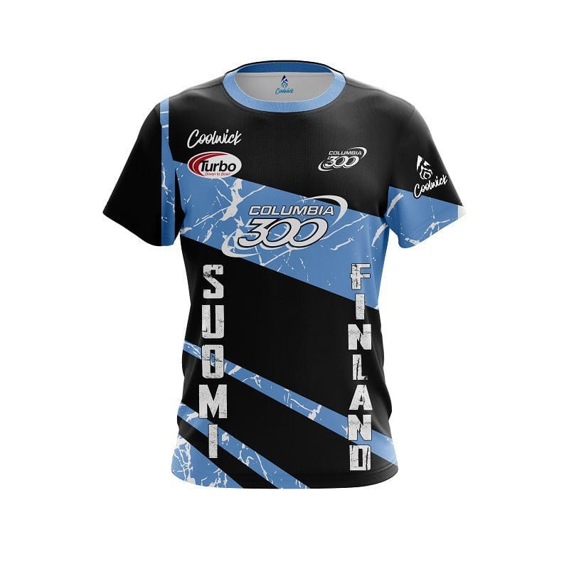 Designed, cut and sewn by hand stay 40% cooler with CoolWick. Our Osku Palermaa Columbia 300 Blue Black Suomi Finland Replica CoolWick Bowling Jerseys are made of two different fabrics with the back being our CoolWick technology fabric that helps wick moisture away and helps air flow more easily through the fibers.