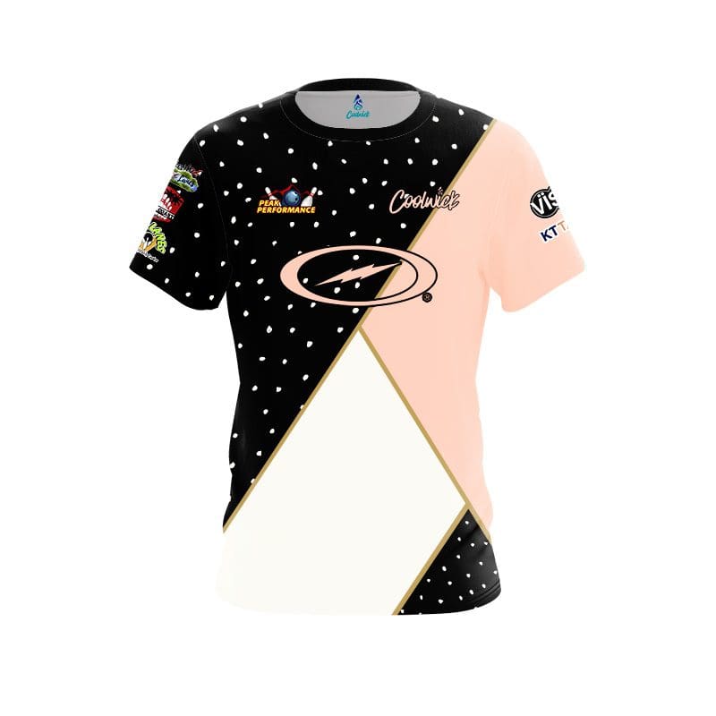 Designed, cut and sewn by hand stay 40% cooler with CoolWick. Our Peak Performance Pastel Gold Dots Replica CoolWick Bowling Jerseys are made of two different fabrics. The back being our CoolWick technology fabric that helps wick moisture away and helps air flow more easily through the fibers.