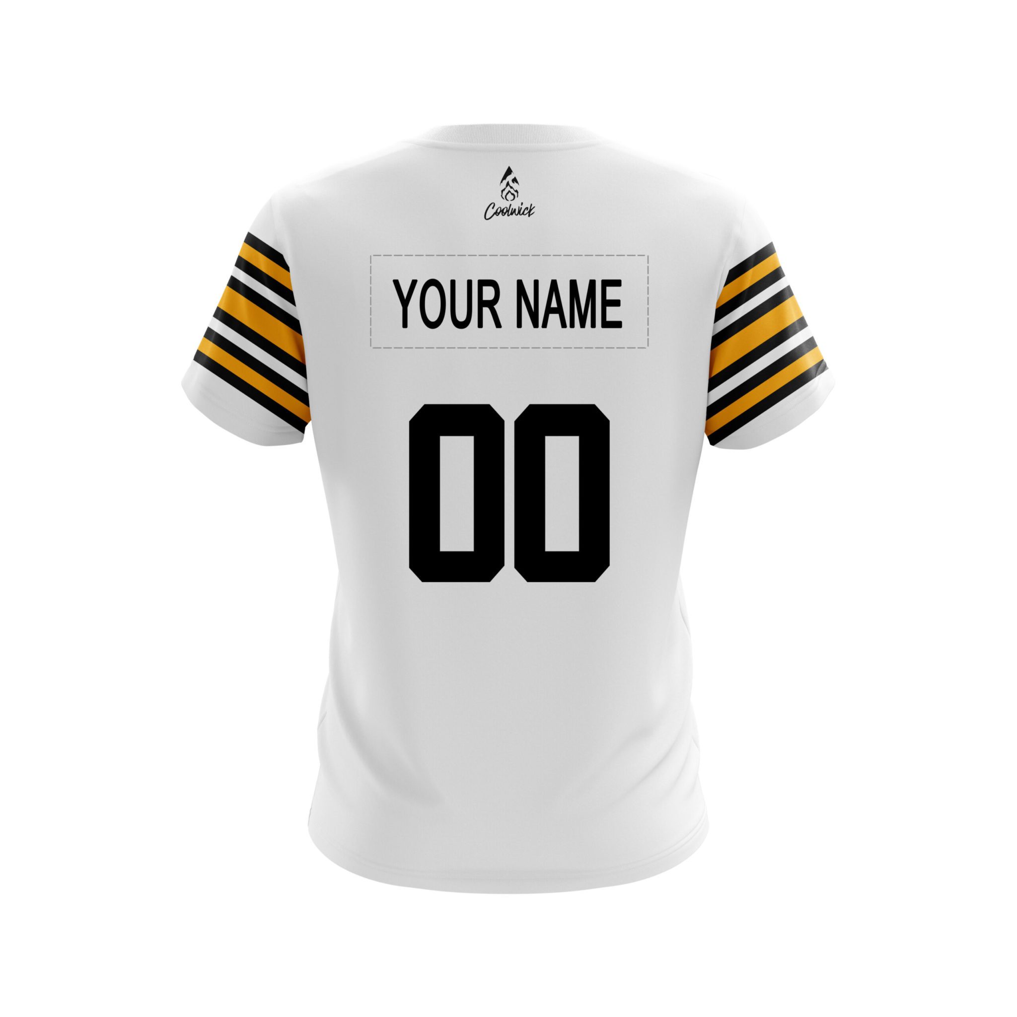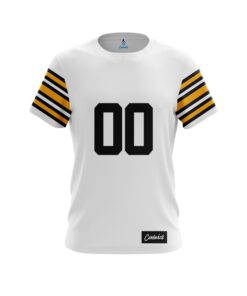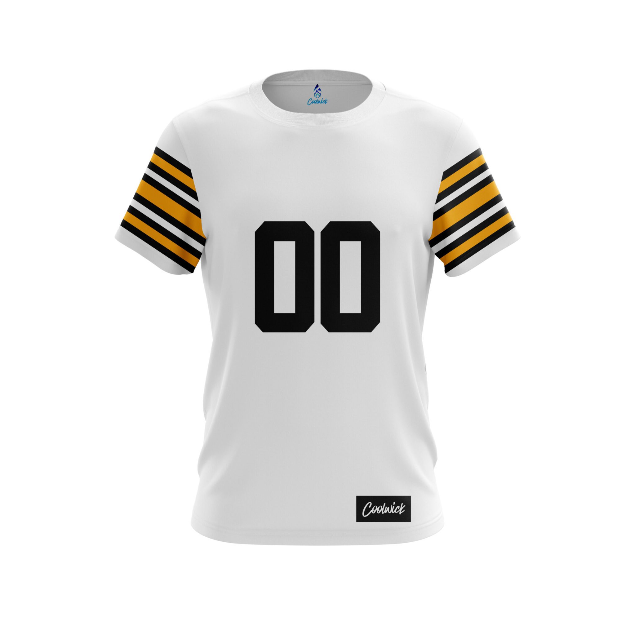 Designed, cut and sewn by hand stay 40% cooler with CoolWick. Our Pittsburgh Away Football CoolWick Bowling Jerseys are made of two different fabrics with the back being our CoolWick technology fabric that helps wick moisture away and helps air flow more easily through the fibers.