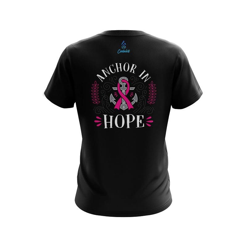 Stay 40% cooler with CoolWick. Our Plain Breast Cancer Anchor Fighter CoolWick Bowling Jerseys are made of two different fabrics with the back being our CoolWick technology fabric that helps wick moisture away and helps air flow more easily through the fibers.