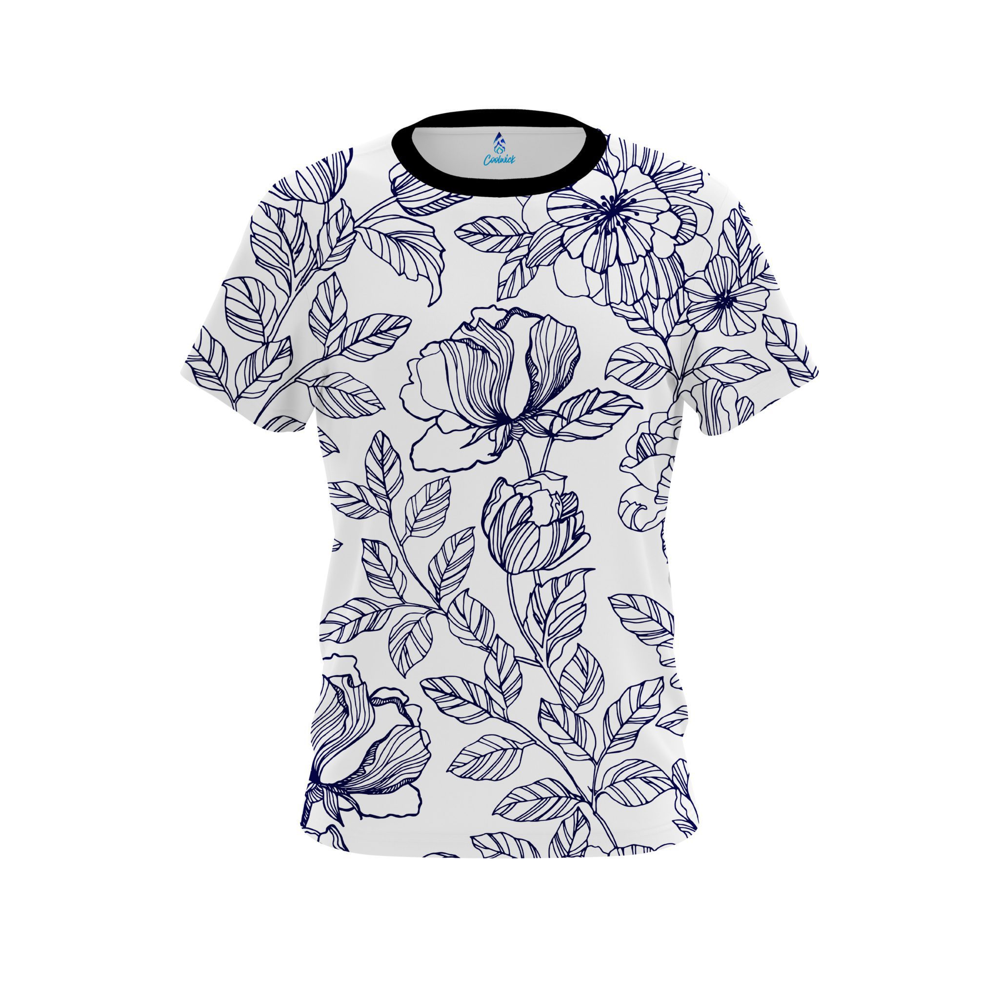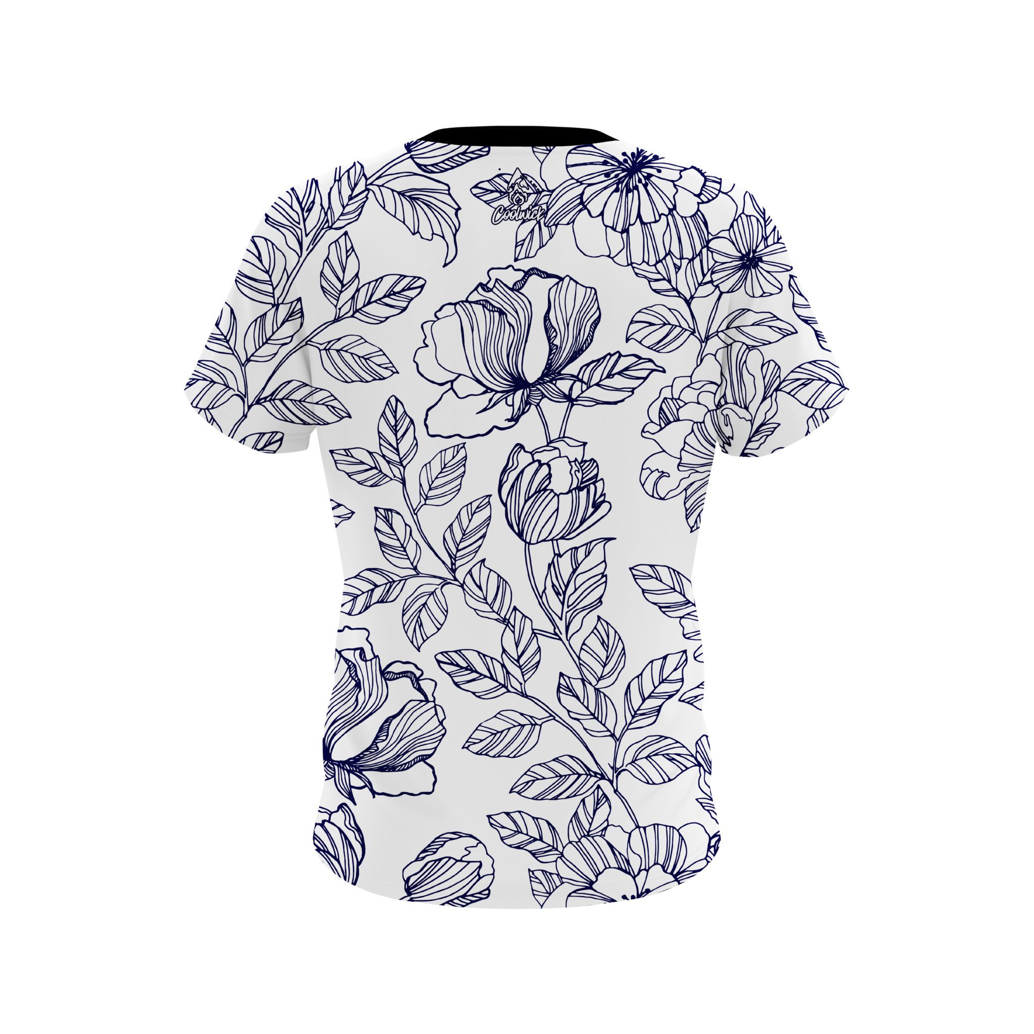Stay 40% cooler with CoolWick. Our Plain Navy Flower Tattoo CoolWick Bowling Jerseys are made of two different fabrics with the back being our CoolWick technology fabric that helps wick moisture away and helps air flow more easily through the fibers.