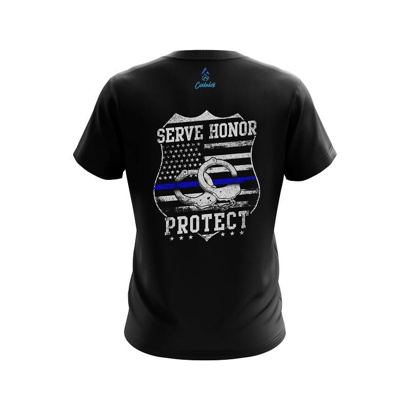 Stay 40% cooler with CoolWick. Our Plain Police Protect CoolWick Bowling Jerseys are made of two different fabrics with the back being our CoolWick technology fabric that helps wick moisture away and helps air flow more easily through the fibers.
