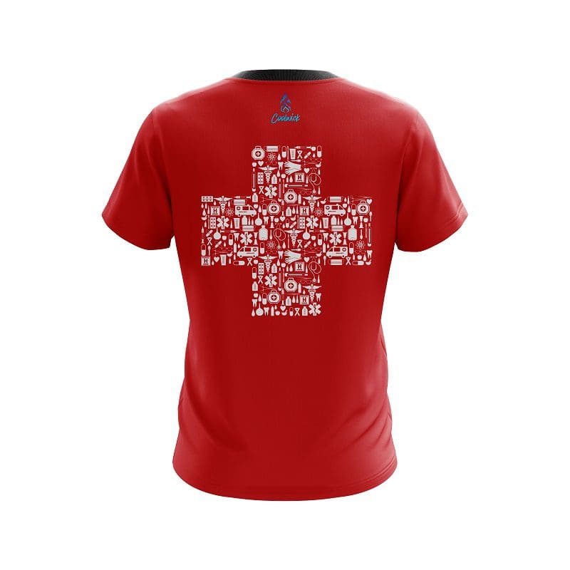Stay 40% cooler with CoolWick. Our Plain Rescue Red Cross CoolWick Bowling Jerseys are made of two different fabrics with the back being our CoolWick technology fabric that helps wick moisture away and helps air flow more easily through the fibers.