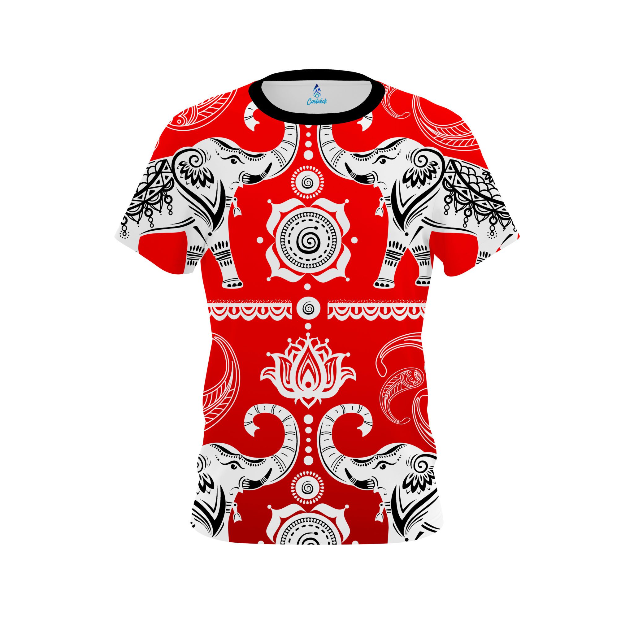 Stay 40% cooler with CoolWick. Our Plain Tribal Elephants Red CoolWick Bowling Jersey are made of two different fabrics with the back being our CoolWick technology fabric that helps wick moisture away and helps air flow more easily through the fibers.