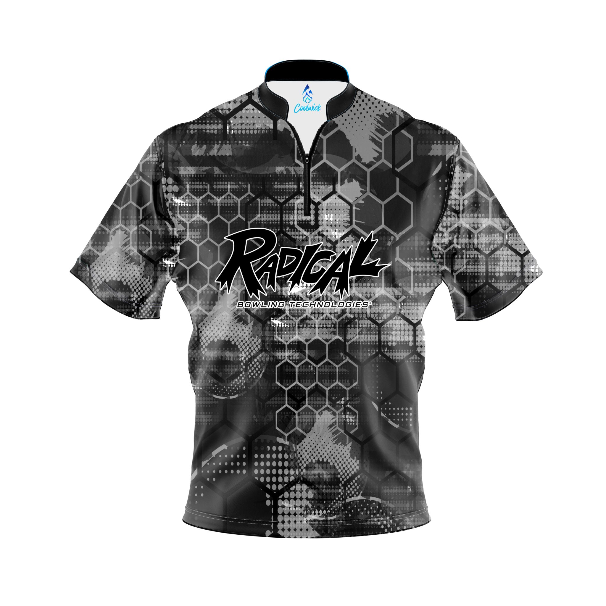Stay 40% cooler with CoolWick. Our Radical Blackout Honeycomb Quick Ship CoolWick Sash Zip Bowling Jerseys are made of CoolWick technology fabric that helps wick moisture away and helps air flow more easily through the fibers.