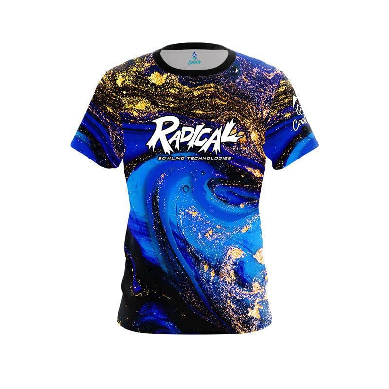 Stay 40% cooler with CoolWick. Our Radical Blue and Gold Liquid Marble CoolWick Bowling Jerseys are made of two different fabrics with the back being our CoolWick technology fabric that helps wick moisture away and helps air flow more easily through the fibers.