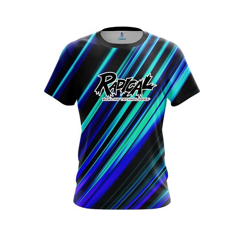 Stay 40% cooler with CoolWick. Our Radical Blue And Green Digital Stripe CoolWick Bowling Jerseys are made of two different fabrics with the back being our CoolWick technology fabric that helps wick moisture away and helps air flow more easily through the fibers.