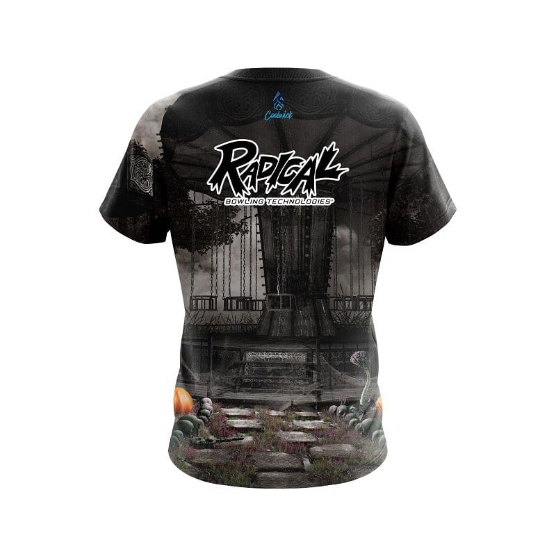 Stay 40% cooler with CoolWick. Our Radical Spooky Carnival Carousel CoolWick Bowling Jerseys are made of two different fabrics with the back being our CoolWick technology fabric that helps wick moisture away and helps air flow more easily through the fibers.