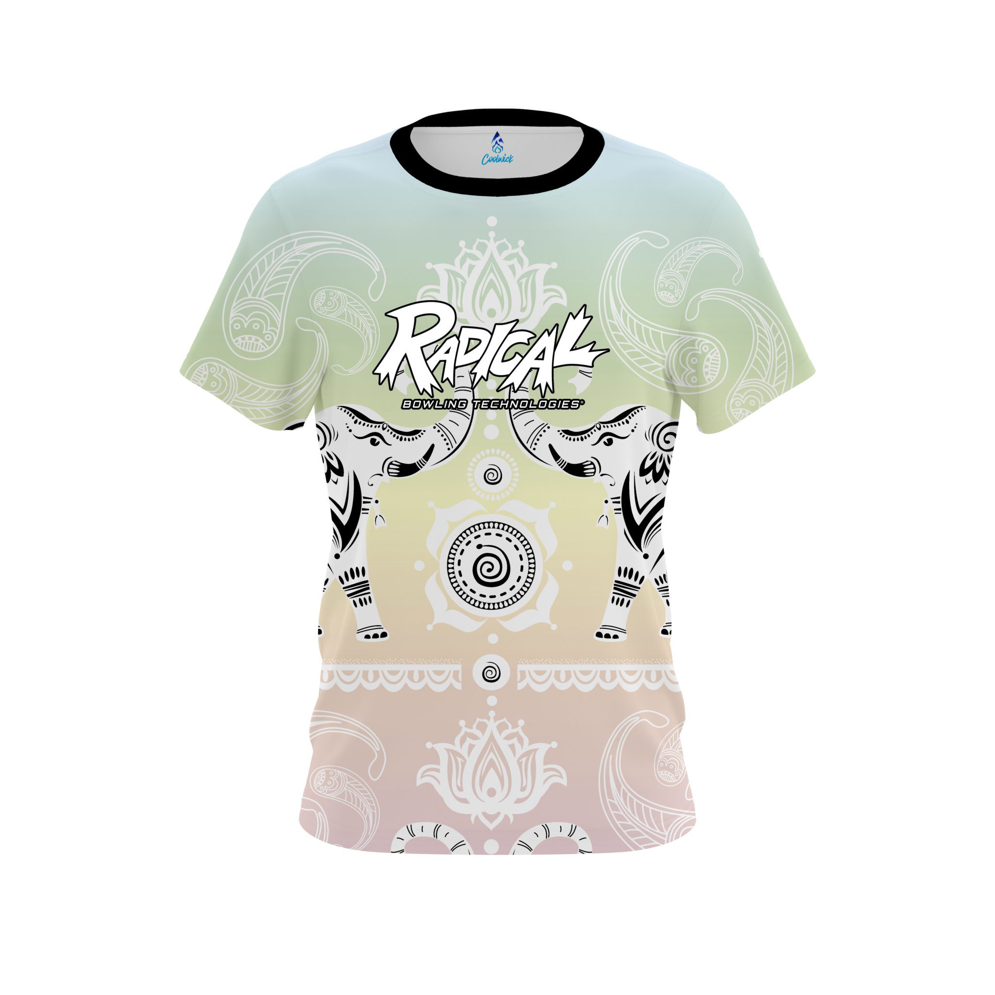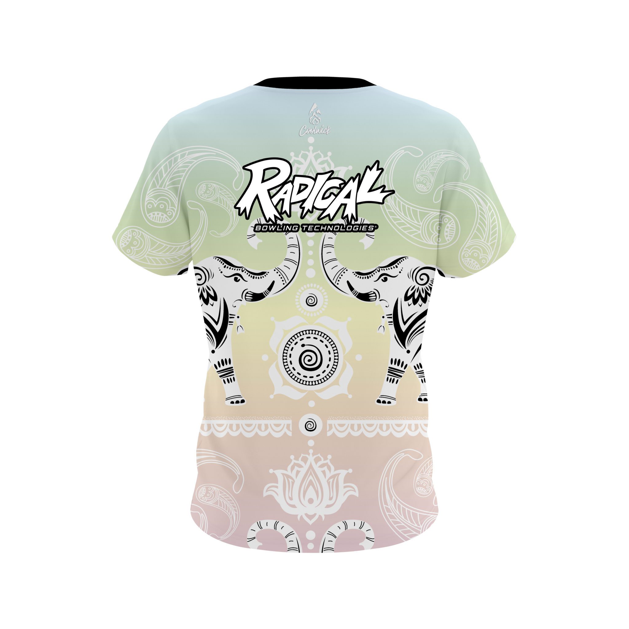 Stay 40% cooler with CoolWick. Our Radical Tribal Elephants Pastel Rainbow CoolWick Bowling Jersey are made of two different fabrics with the back being our CoolWick technology fabric that helps wick moisture away and helps air flow more easily through the fibers.