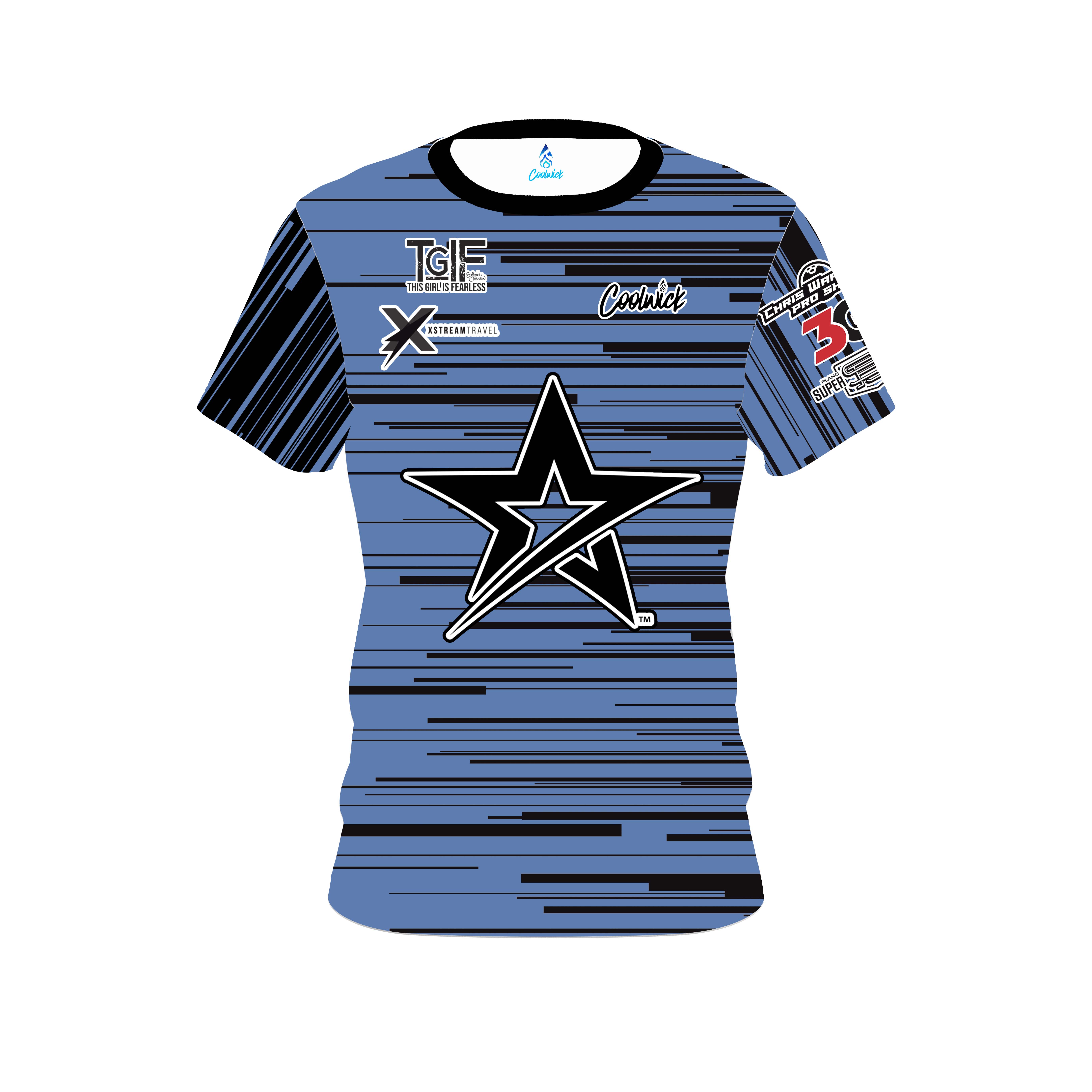 Stay 40% cooler with CoolWick. Our Stefanie Johnson Roto Grip Black Blue Horizontal CoolWick Bowling Jerseys are made of two different fabrics with the back being our CoolWick technology fabric that helps wick moisture away and helps air flow more easily through the fibers.