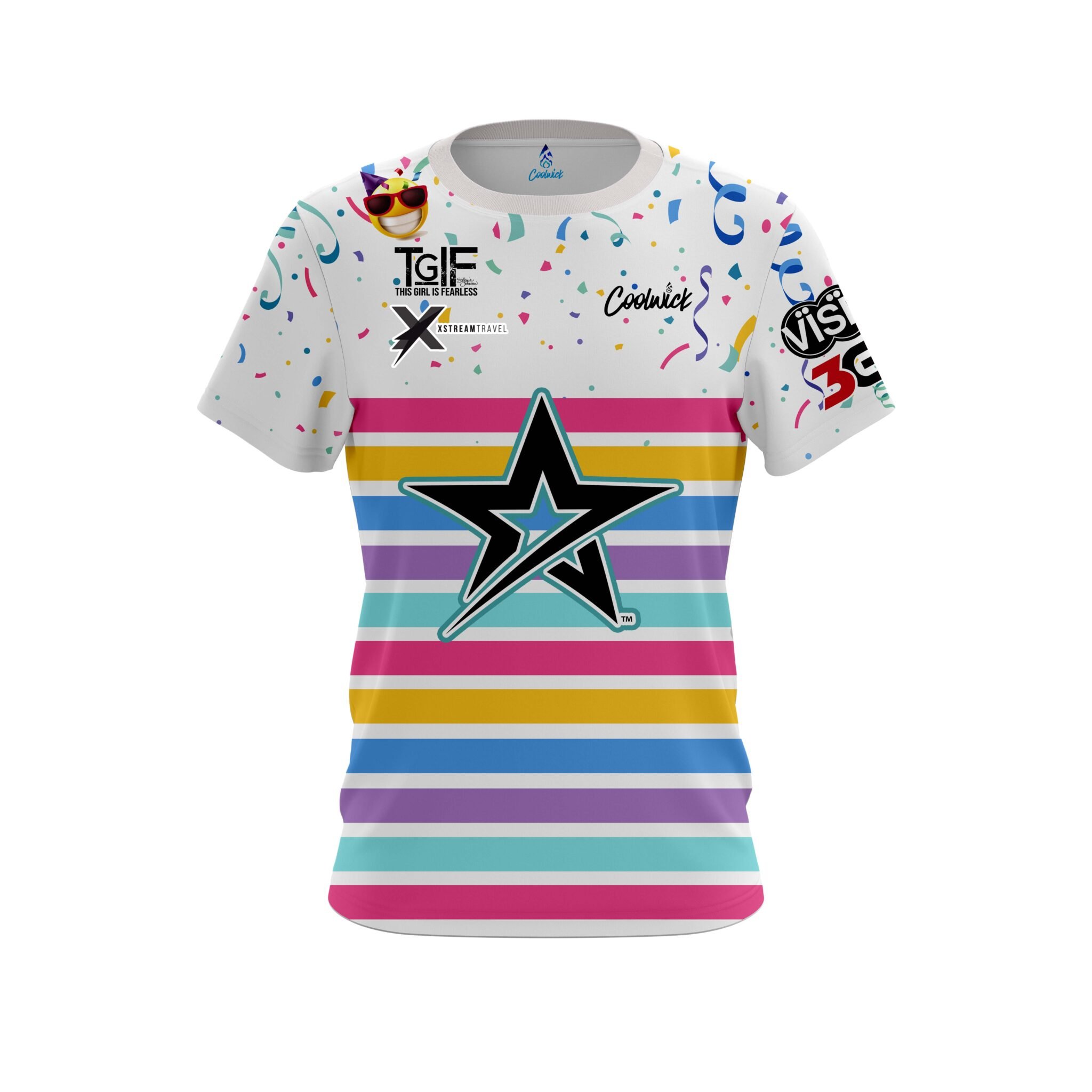 Stay 40% cooler with CoolWick. Our Stefanie Johnson Roto Grip confetti CoolWick Bowling Jerseys are made of two different fabrics with the back being our CoolWick technology fabric that helps wick moisture away and helps air flow more easily through the fibers.