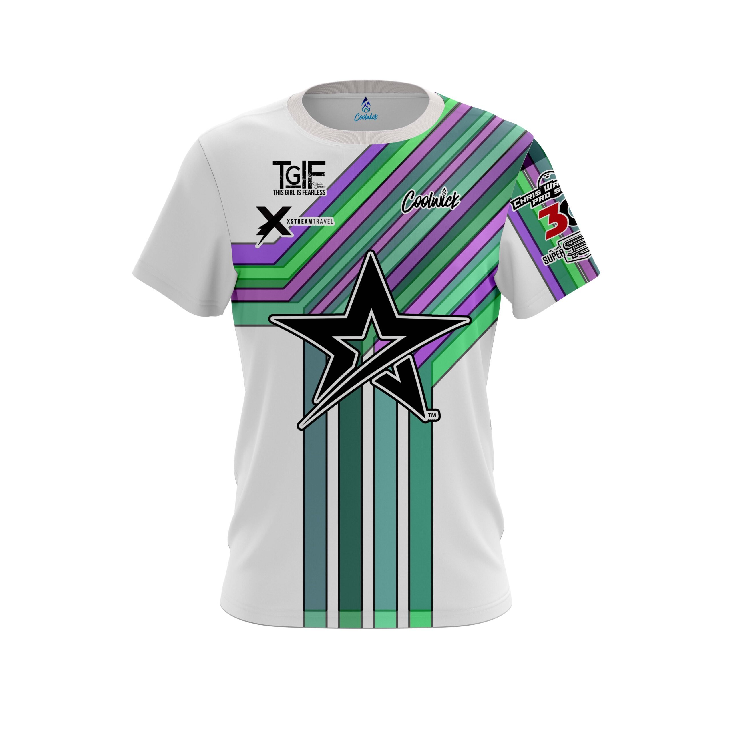Stay 40% cooler with CoolWick. Our Stefanie Johnson Roto Grip Violet Blue Lines CoolWick Bowling Jerseys are made of two different fabrics with the back being our CoolWick technology fabric that helps wick moisture away and helps air flow more easily through the fibers.