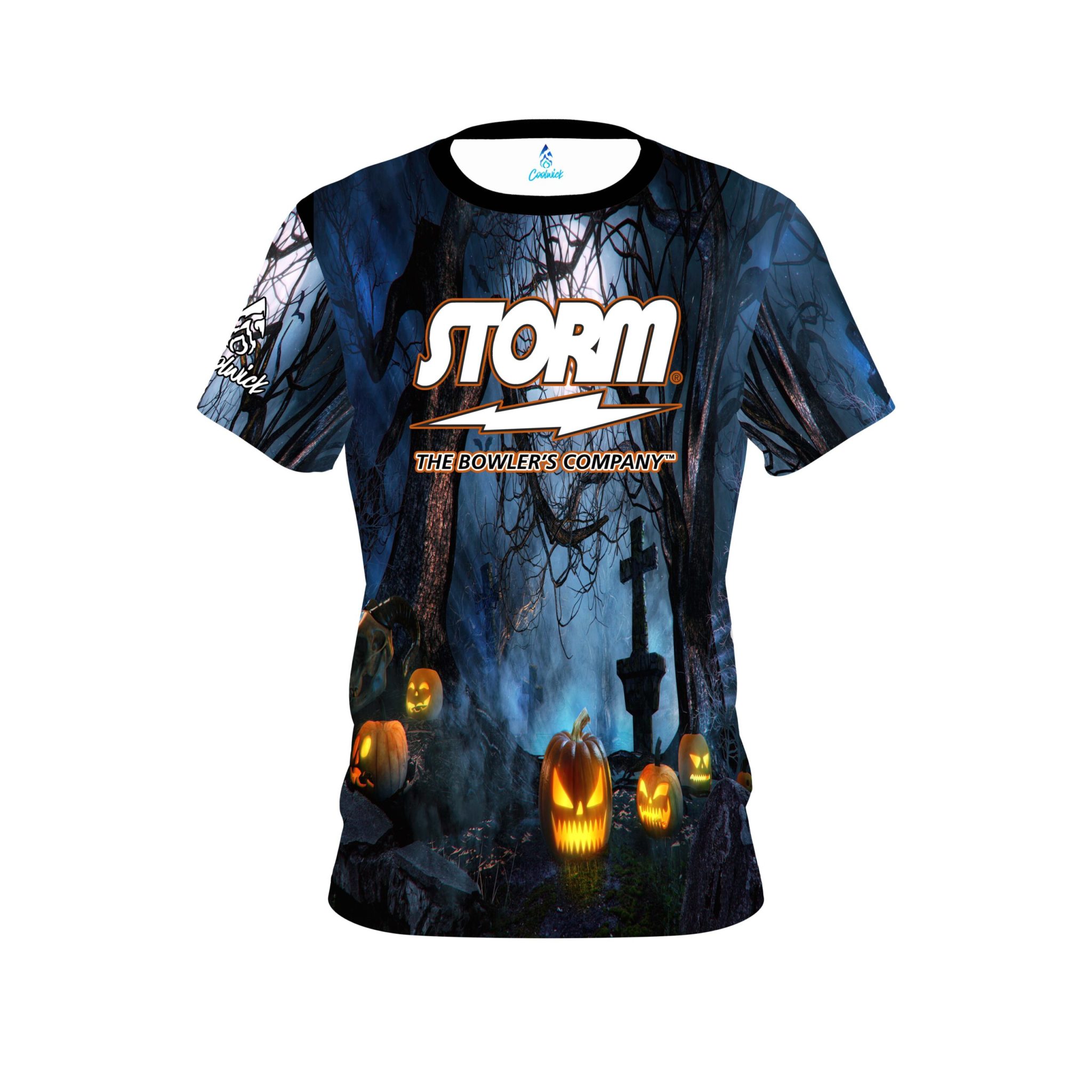 Stay 40% cooler with CoolWick. Our Storm Halloween Pumpkin Alley Coolwick Bowling Jerseys are made of two different fabrics with the back being our CoolWick technology fabric that helps wick moisture away and helps air flow more easily through the fibers.
