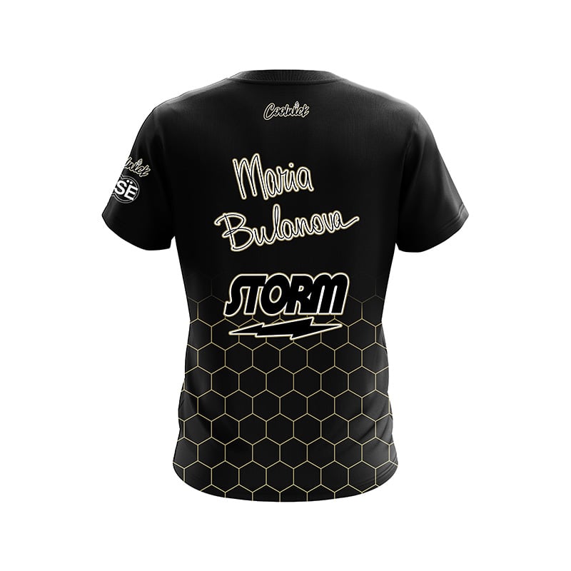 Shop now and elevate your game with the Storm Maria Bulanova Black Gold Honeycomb CoolWick Bowling Jersey – exceeding the benchmark of performance and style.