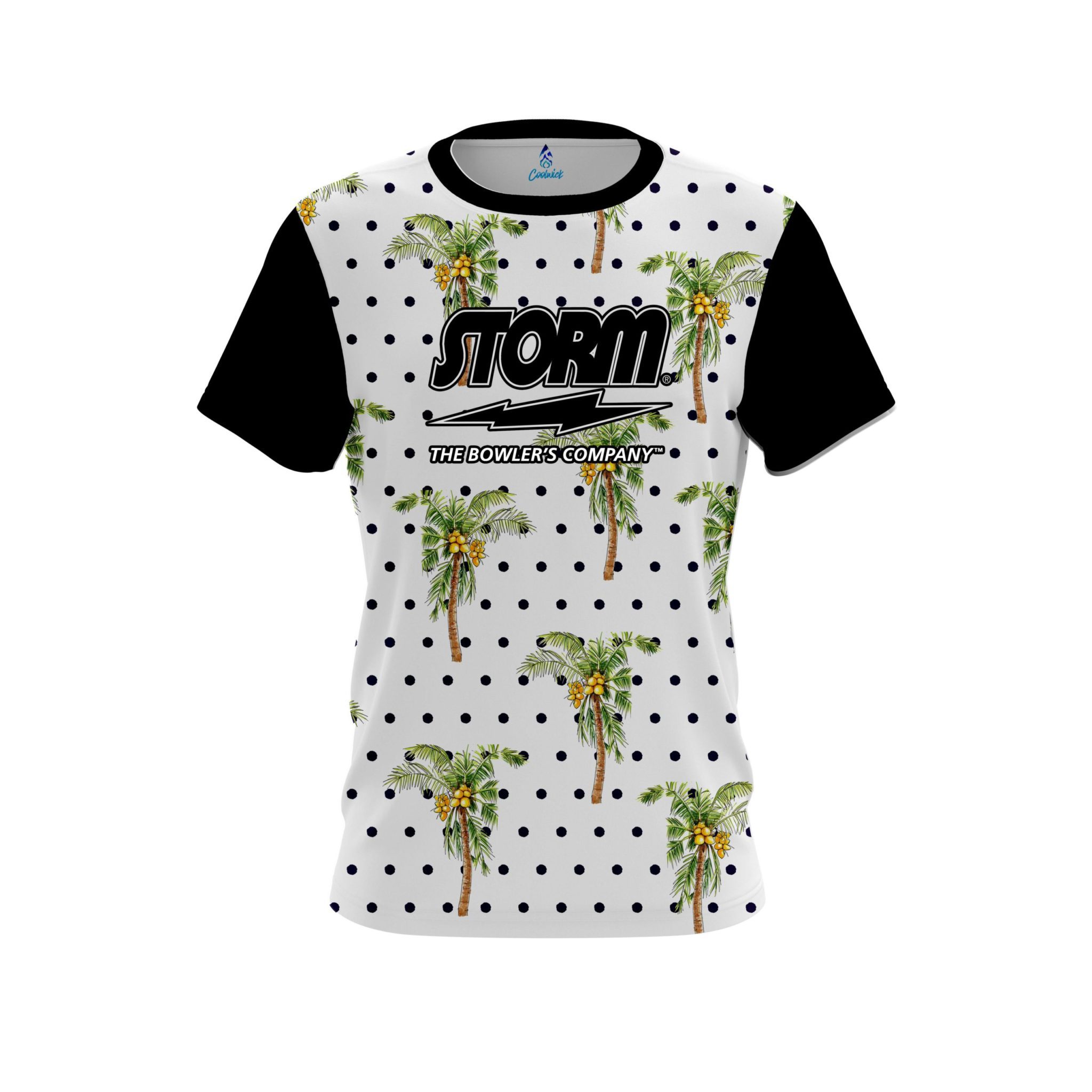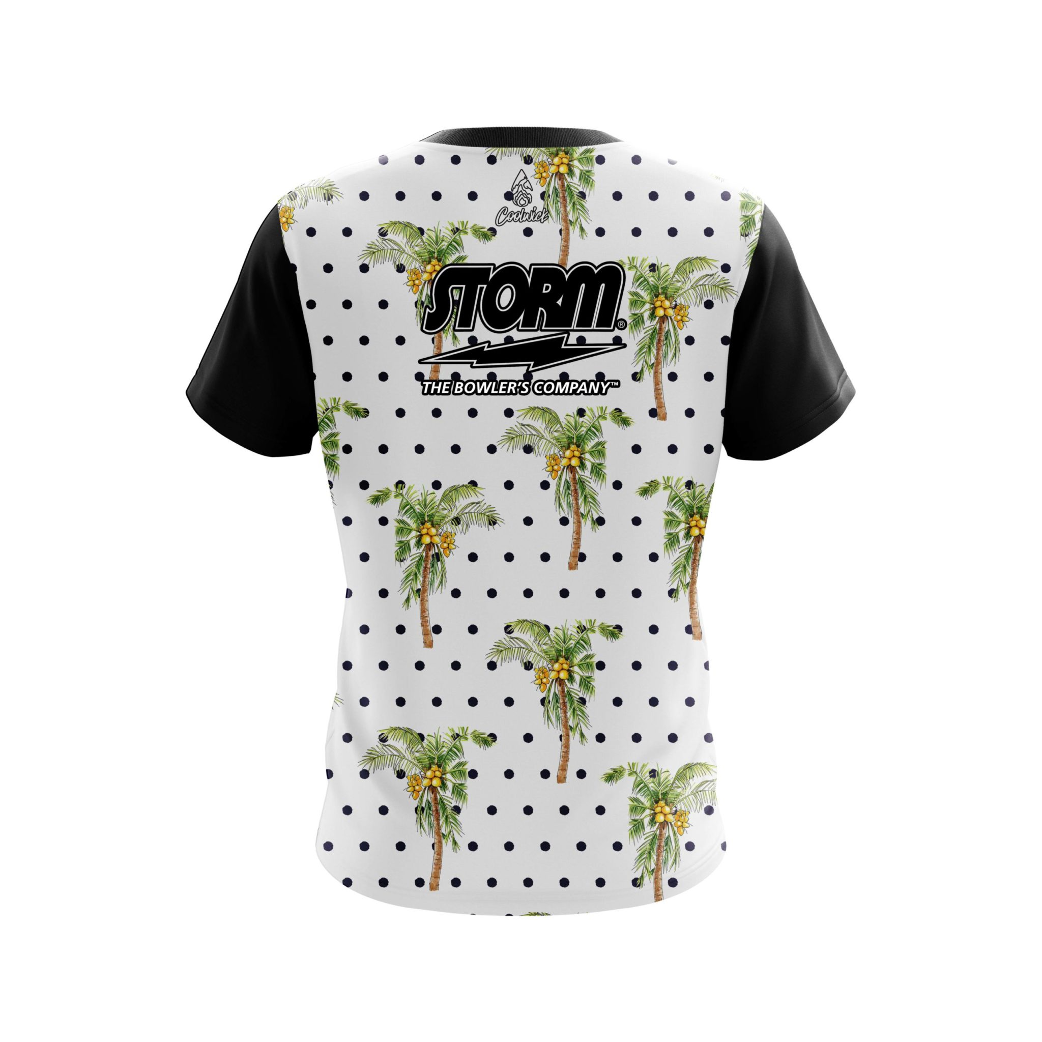 Stay 40% cooler with CoolWick. Our Storm Polka Dots Palm Trees CoolWick Bowling Jerseys are made of two different fabrics with the back being our CoolWick technology fabric that helps wick moisture away and helps air flow more easily through the fibers.