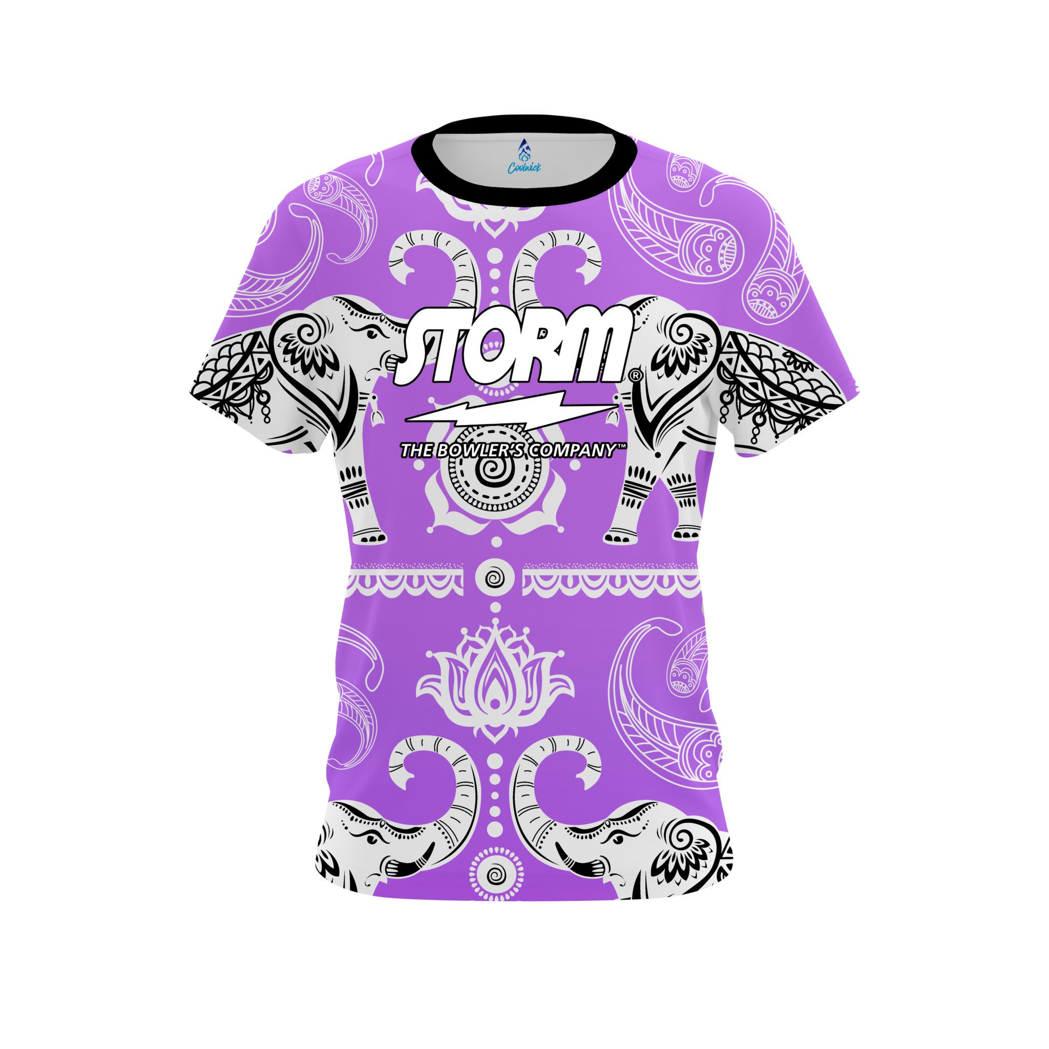 Stay 40% cooler with CoolWick. Our Storm Tribal Elephants Purple CoolWick Bowling Jersey are made of two different fabrics with the back being our CoolWick technology fabric that helps wick moisture away and helps air flow more easily through the fibers.
