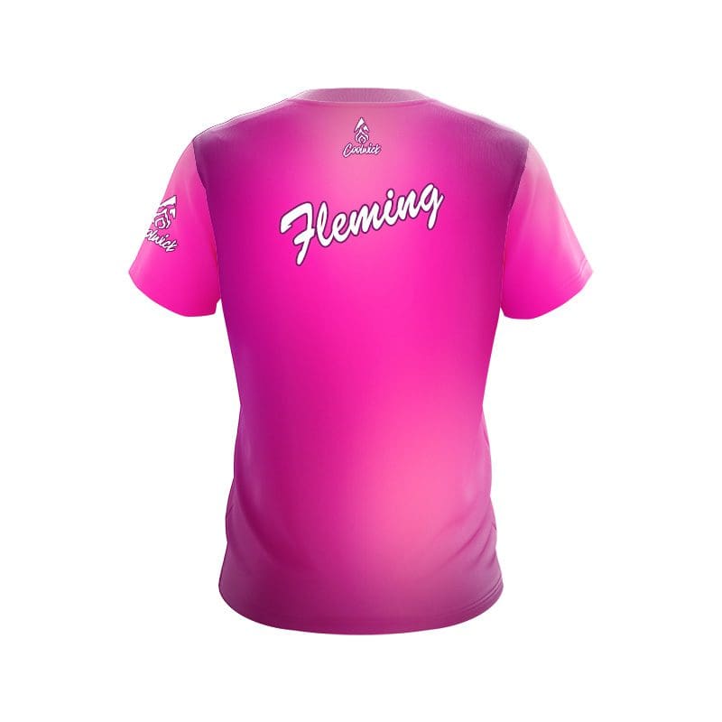 Designed, cut and sewn by hand stay 40% cooler with CoolWick. Our Tinickia Fleming Pink Fade CoolWick Bowling Jerseys are made of two different fabrics. The back being our CoolWick technology fabric that helps wick moisture away and helps air flow more easily through the fibers.