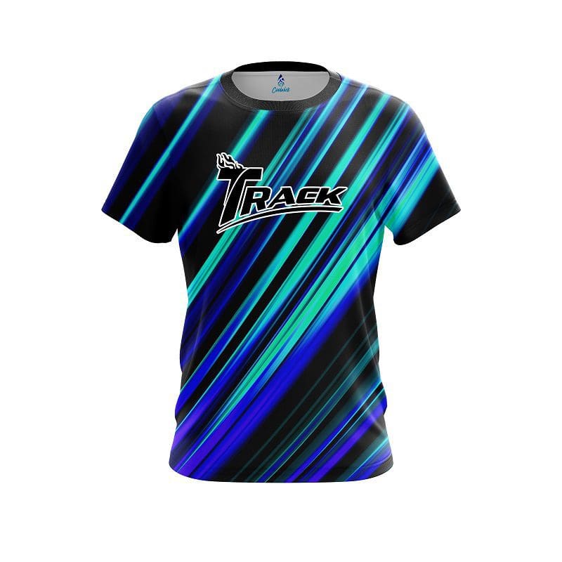 Stay 40% cooler with CoolWick. Our Track Blue And Green Digital Stripe CoolWick Bowling Jerseys are made of two different fabrics with the back being our CoolWick technology fabric that helps wick moisture away and helps air flow more easily through the fibers.