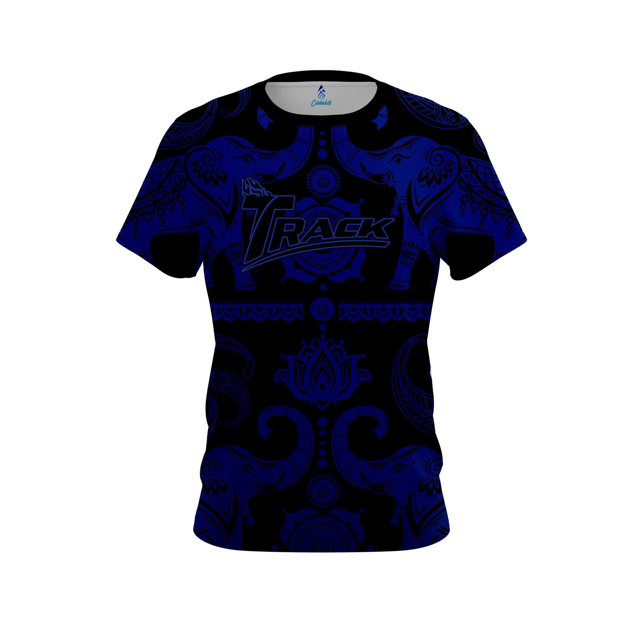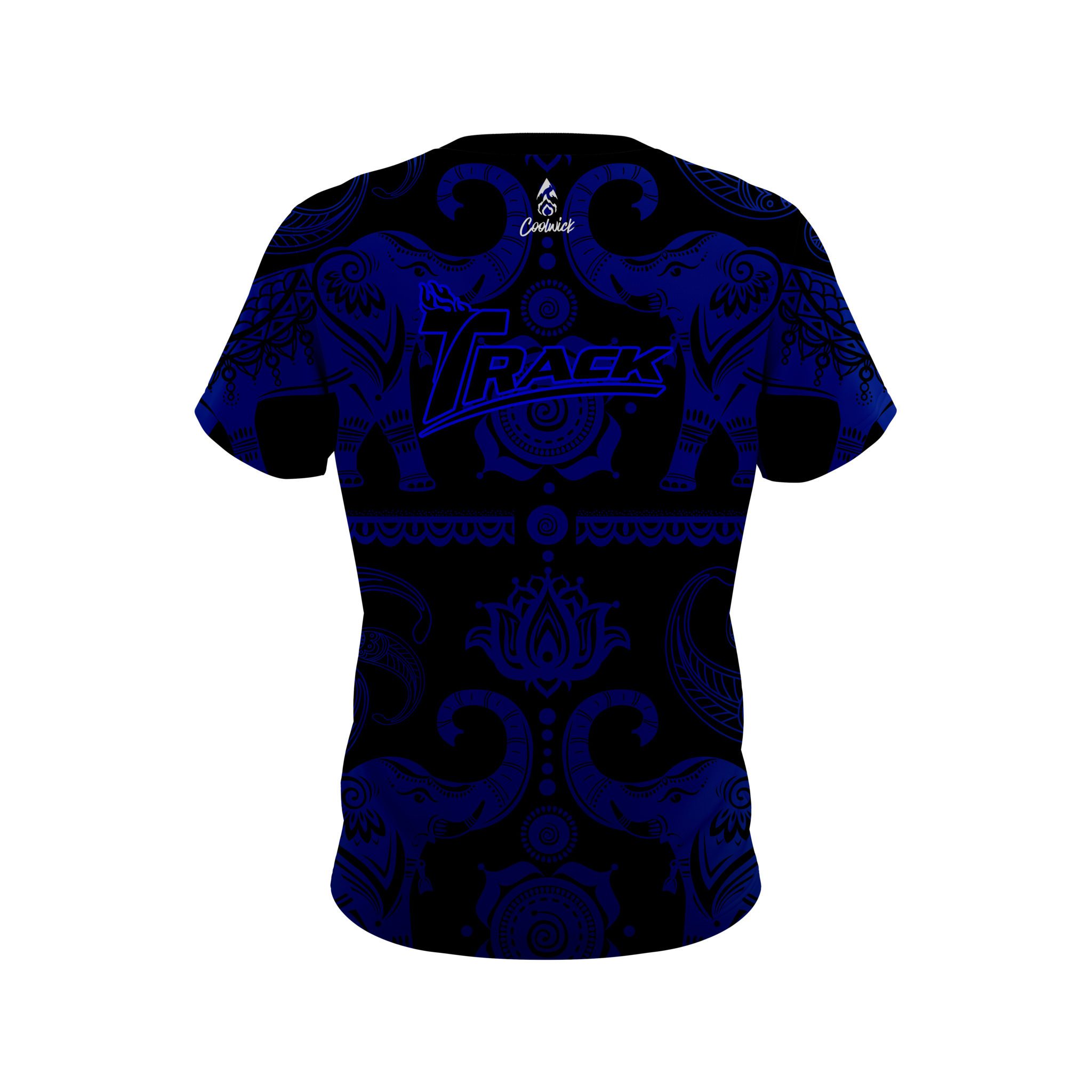 Stay 40% cooler with CoolWick. Our Track Tribal Elephants Blue and Black CoolWick Bowling Jerseys are made of two different fabrics with the back being our CoolWick technology fabric that helps wick moisture away and helps air flow more easily through the fibers.