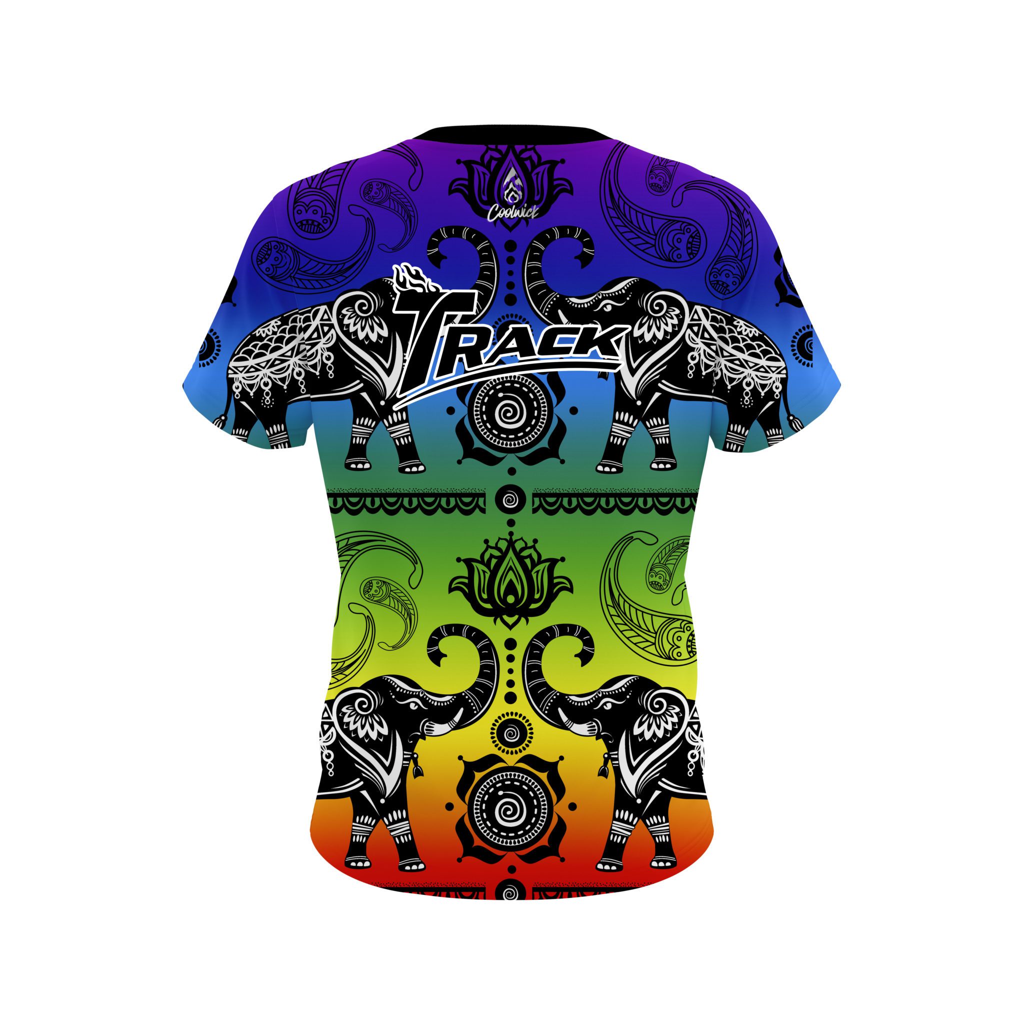 Stay 40% cooler with CoolWick. Our Track Tribal Elephants Rainbow CoolWick Bowling Jerseys are made of two different fabrics with the back being our CoolWick technology fabric that helps wick moisture away and helps air flow more easily through the fibers.