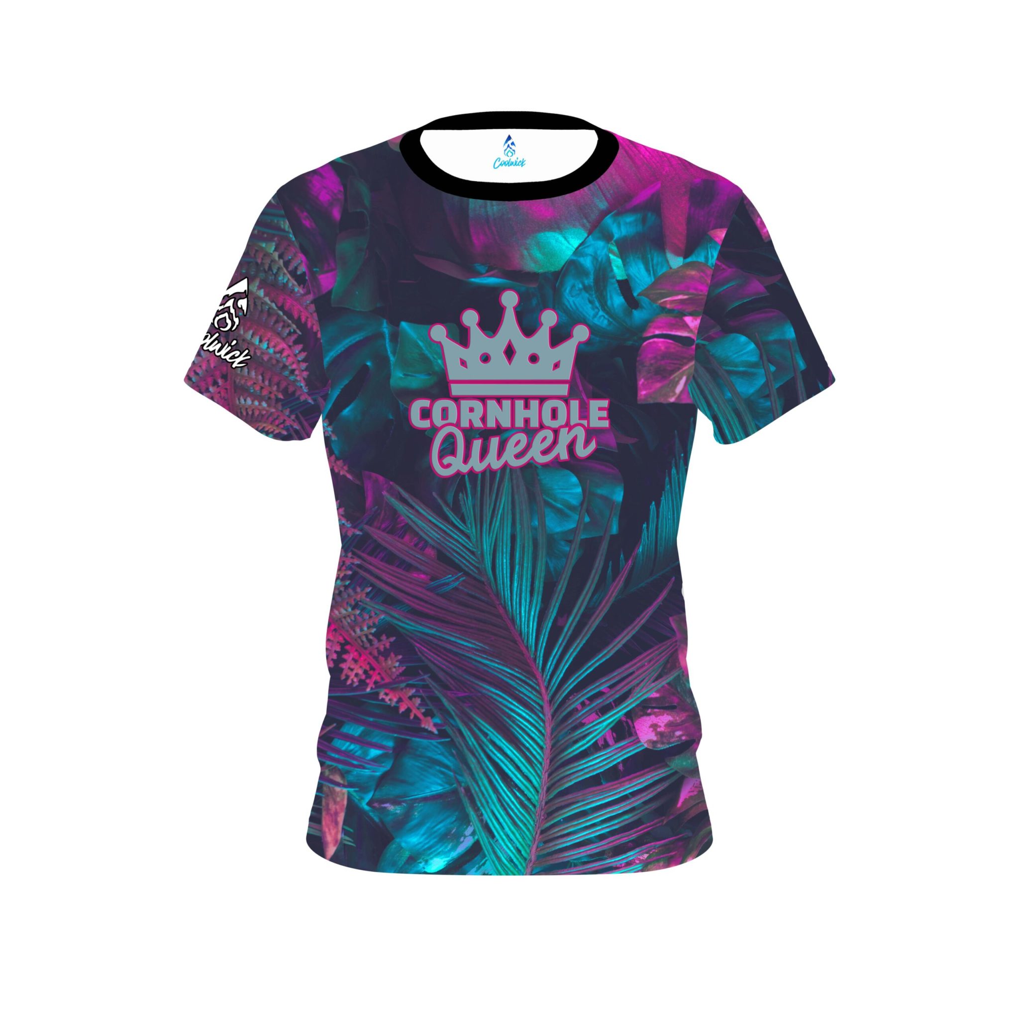Stay 40% cooler with CoolWick. Our Tropical Jungle Cornhole Queen Coolwick Jerseys are made of two different fabrics with the back being our CoolWick technology fabric that helps wick moisture away and helps air flow more easily through the fibers.